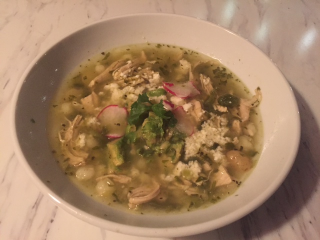 Ladle the posole into bowls and garnish each serving with avocado, thinly sliced radish, queso fresco, and chopped cilantro. Serves 8.