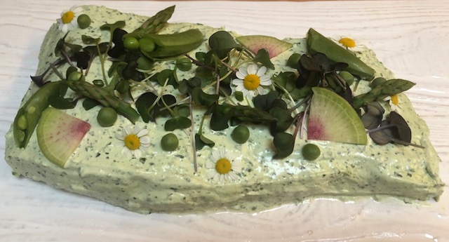 Spread Green Goddess over cold poached salmon, options for garnish; microgreens, edible flowers, snow peas, radishes or additional spring veggies. Serves 6-8 depending on what else you may be serving.