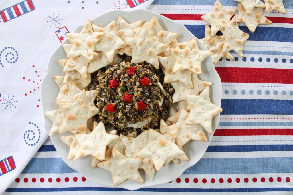 Appetizer-easy to make olive tapenade served with seasonal star crackers from Lavosh found at Sprouts market
