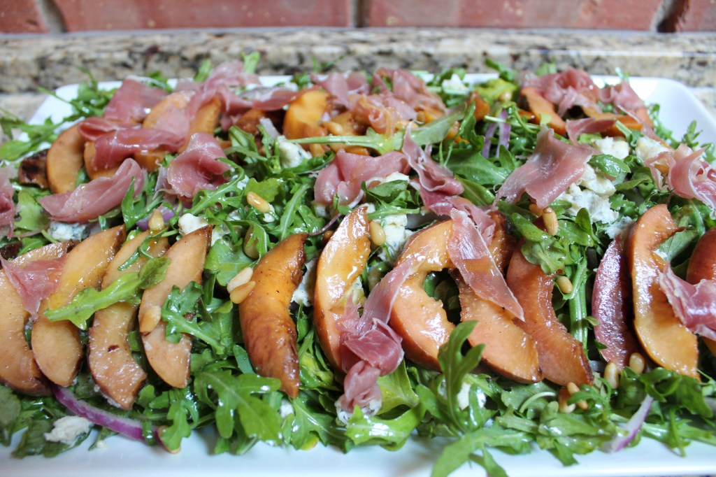 Brush peaches with olive oil and place peach wedges on grill pan; grill 30 seconds on each side or until grill marks appear but peaches are still firm. Remove from grill; set aside. Toss arugula with vinaigrette (reserving a little to drizzle over the top). Arrange arugula on a platter. Top with peach wedges and prosciutto and goat cheese. Drizzle with remaining vinaigrette.