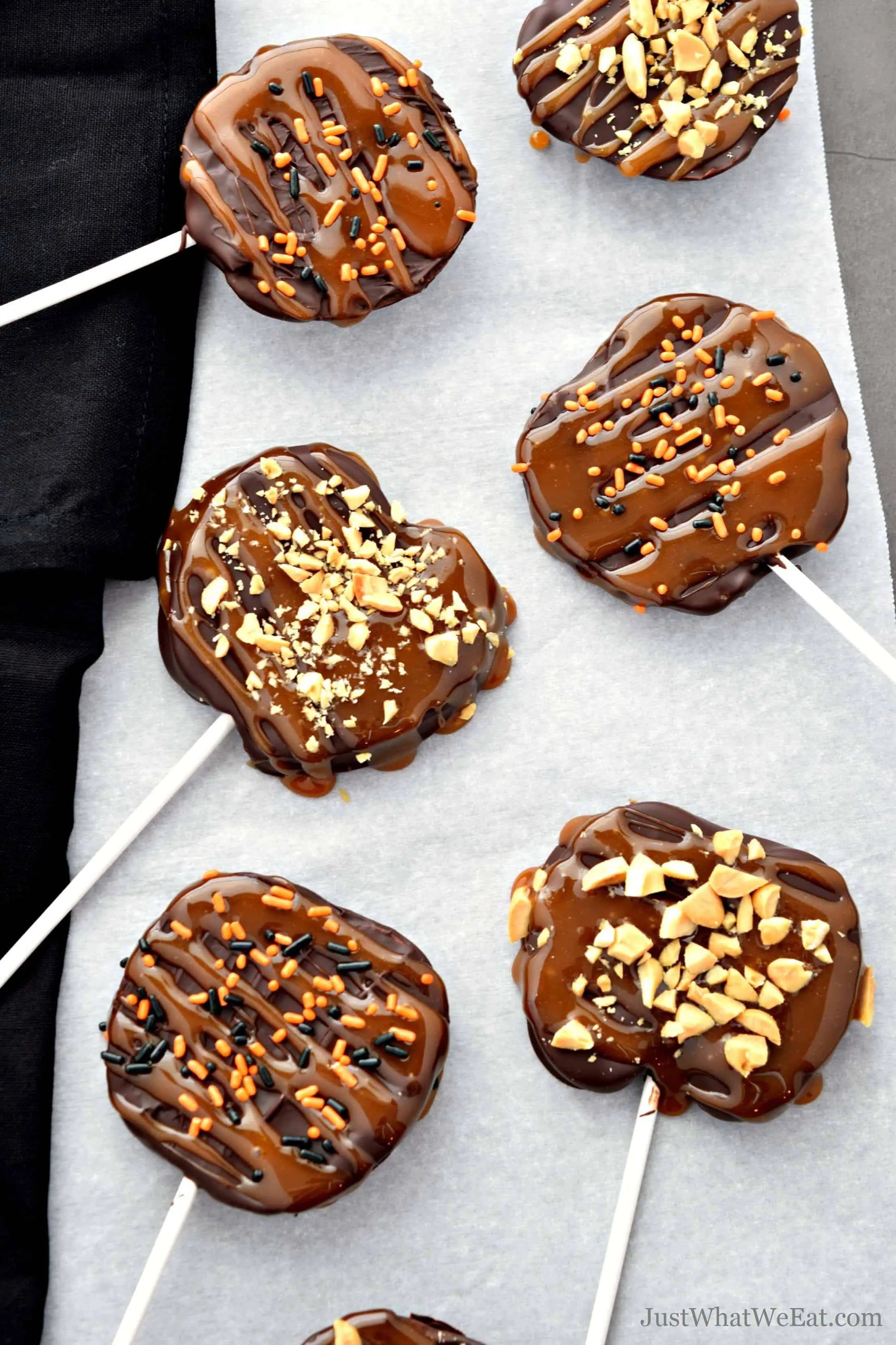 Chocolate Turtle Apple SlicesI used Fuji Apples, slice about 1/2 inch thick, using a sharp knife make a slit for sick; insert. Melt chocolate chips and using a spoon, pour chocolate over apple, while warm add nuts and sprinkles. Cool then drizzle caramel. Best eaten same day.