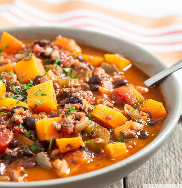 Butternut Squash, Beef and Black Bean Chili 1¼ lb. ground beef 1/3 cup sweet onion 1 red bell pepper, chopped 3 clove garlic cloves, minced Flour Olive oil 2 Tbls. chili powder 1 Tbls. dried oregano 1 tsp. cumin 21/2 cups butternut squash; diced (one small) 5 cups beef stock 1 can black beans; rinsed and drained 1 can fire-roasted diced tomatoes; drained 2-3 chipotle peppers in adobe; seeds removed and chopped⅓ cup cilantro Chihuahua cheeseCook beef and drain. Saute onion and red pepper in olive oil, add garlic at the end. Add chili powder, oregano, cumin and pumpkin then add flour to make a roux; cook 1 more minute add stock. Stir in remaining ingredients. Bring to a boil; reduce heat to low and simmer 20 to 25 minutes or until pumpkin is tender, then add cilantro. Serve with cheese and sour cream. Serves 6-8.