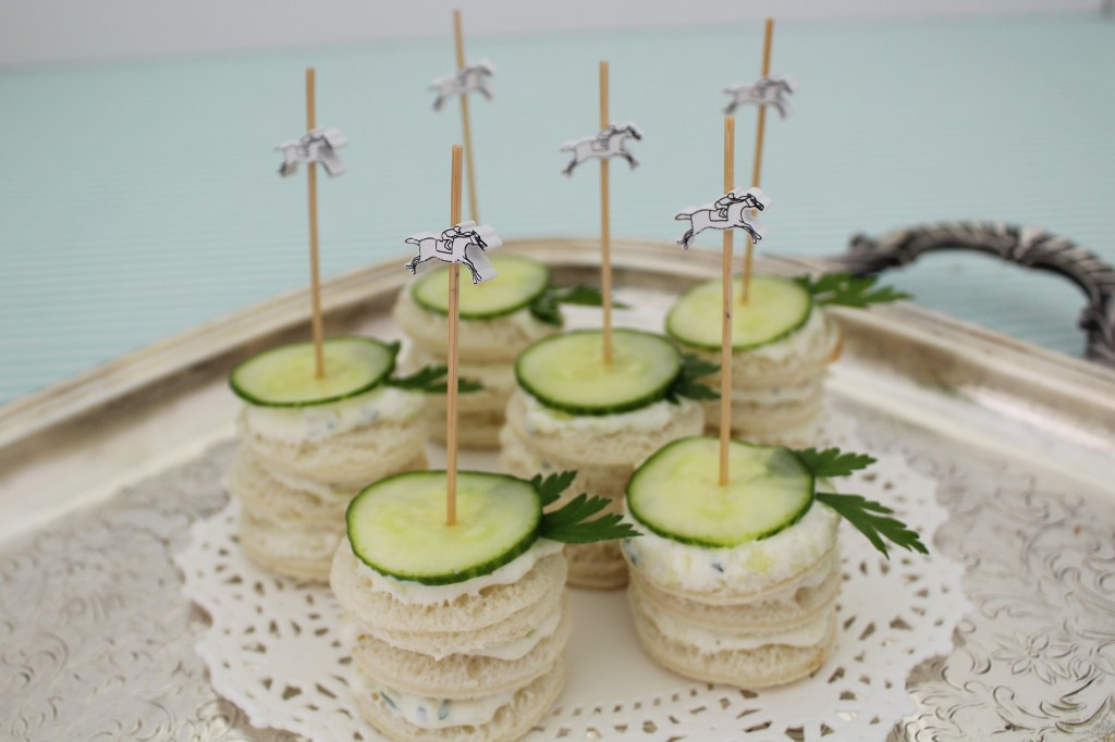Peel cucumber and slice in half lengthwise; remove seeds with a small spoon. Place cucumber in a food processor and pulse about 5 times, until cucumber is minced. Place cucumber into a small glass mixing bowl. Place onion in the food processor, pulsing until it is finely chopped. Add onion to cucumber. Add cream cheese and mayonnaise stir well with a spatula. Add rest of ingredients. With a round cookie cutter, cut rounds out of bread slices. Spread a small amount of mayonnaise on bread rounds. Spread cheese mixture on half the rounds and top with another round. Garnish with a sprig of parsley or dill.